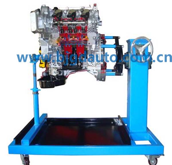 設備采用電控發動機總成實物制作,發動機的關鍵部位加以爆炸式解剖,解剖剖面采用硬拉絲鍍膜工藝、精細分色,內部和外部機件電鍍處理,其他部件鈍化防腐,根據用戶要求采用各種材質、各種形狀的底座。發動機采用減速電機驅動。配置射燈直觀、清晰觀察發動機的組成和機構的運動關系,采用光電程控技術,通過LED燈顯示發動機各缸工作狀態。氣缸、活塞、曲軸連桿、凸輪軸、進氣門、排氣門、氣門頂、火花塞、噴油器、進氣歧管、排氣歧管、發電機、機油泵、水泵、節溫器、噴油嘴、節氣門體等內部結構清晰可見。利用本實驗臺可以使學員輕松、真實地了解發動機機械系統的組成、各部件的外形、各機構彼此之間的連接和運動關系,加深學生對發動機機械系統組成和工作原理的理解,幫助學生理解抽象的控制理論。本實驗臺制作精致,設計合理,安全可靠,教學功能完備,是各類培訓機構講授汽車發動機結構課程的理想教學平臺。