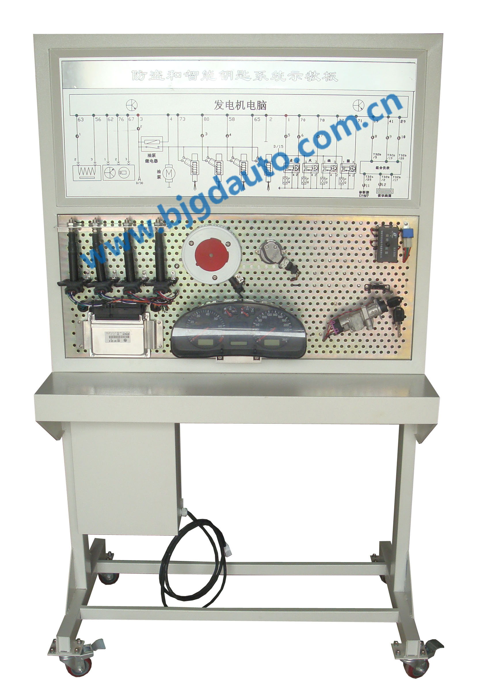 設備采用原車汽油發動機防盜系統器件組成,包括:發動機電腦、防盜模塊、讀識線圈、點火開關、診斷接口、組合儀表、曲軸位置傳感器、凸輪軸位置傳感器、點火線圈、火花塞等。外加系統主要包括: 故障設置系統、故障顯示裝置、檢測端子以及安全防護裝置等。本臺架可以完整展示防盜系統的組成、結構和工作原理,可以進行系統常見故障的模擬、診斷和檢測實操訓練,提高學生分析和解決實際問題的能力,適合中高等汽車院校與培訓機構對學員進行車身電器系統的教學需要。