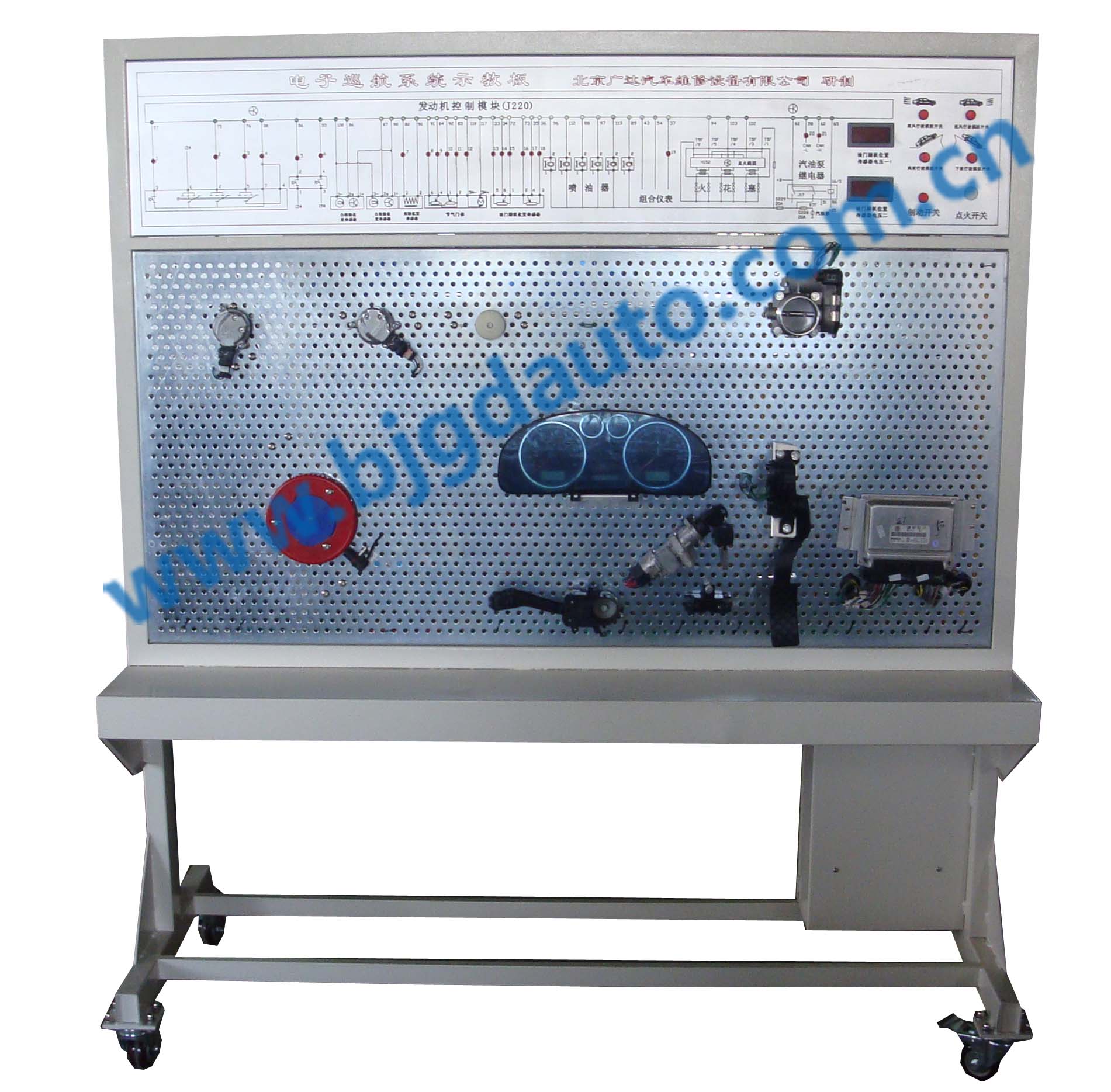 電路原理圖面板制造工藝先進(jìn),采用高端鋁塑板噴繪技術(shù)加工,不變形,不褪色。學(xué)員可直觀對(duì)照電路圖和實(shí)物,認(rèn)識(shí)和分析該系統(tǒng)的工作原理。面板安裝有4mm外接檢測(cè)端子,可直接在面板上檢測(cè)各傳感器、執(zhí)行器、控制單元管腳的參數(shù),如電阻、電壓、電流、頻率信號(hào)等。