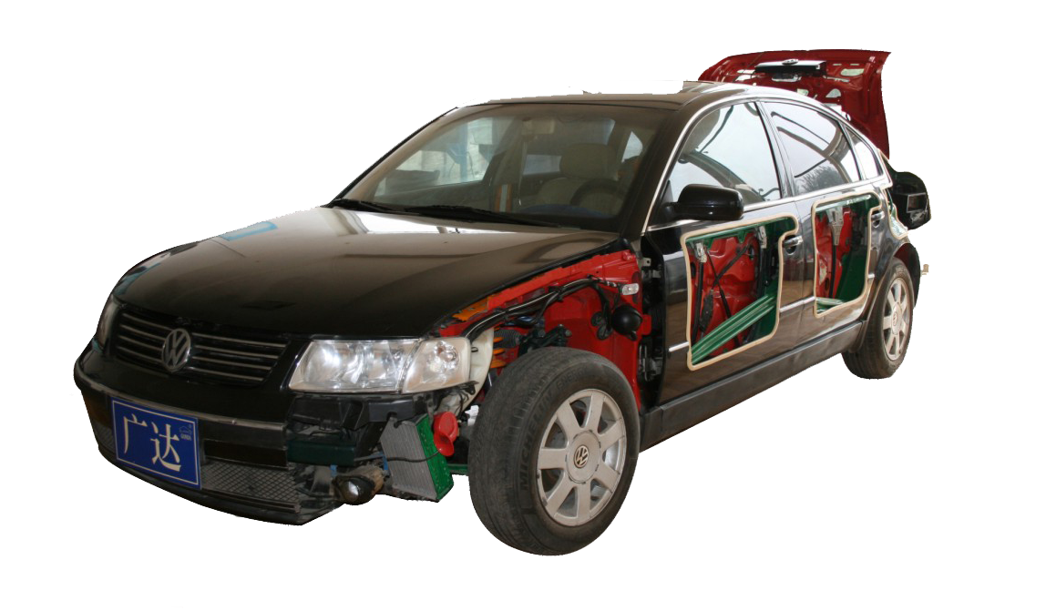 設(shè)備采用轎車整車改造制作而成, 在保持原車板金、機(jī)械、電器各個(gè)系統(tǒng)相對(duì)完整的基礎(chǔ)上,對(duì)車身覆蓋件和車架的關(guān)鍵部位進(jìn)行合理解剖,展示系統(tǒng)的內(nèi)部結(jié)構(gòu)。同時(shí)對(duì)電器電控系統(tǒng)進(jìn)行改造。臺(tái)架動(dòng)力系統(tǒng)、傳動(dòng)系統(tǒng)、空調(diào)系統(tǒng)、ABS防抱死制動(dòng)系統(tǒng)具備正常啟動(dòng)運(yùn)行功能的前提下,同時(shí)具備對(duì)電器電控系統(tǒng)的故障設(shè)置、檢測(cè)與分析等實(shí)訓(xùn)功能。外加系統(tǒng)主要包括:檢測(cè)端子、故障設(shè)置系統(tǒng)、故障顯示裝置等。